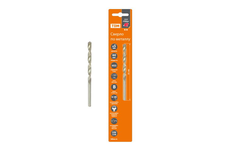 Сверло по металлу, 5 мм, полир., HSS, класс точн. В, 118?, цилиндр. хв., блистер 1 шт, "Рубин" TDM (кр.1шт)