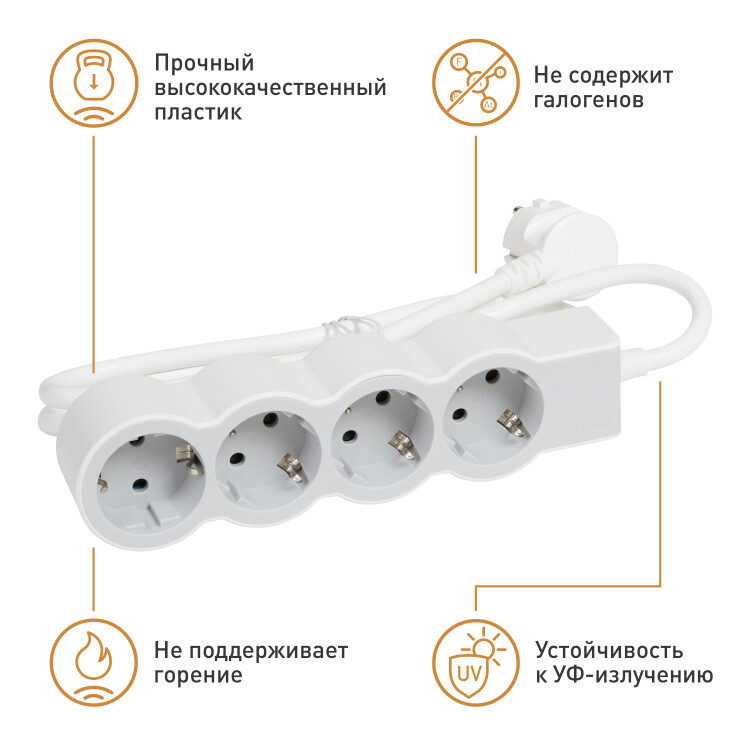 Высококачественный самозатухающий пластик корпуса не содержит галогенов, устойчив к ультрафиолетовому излучению. Всё это обеспечивает долговечное и безопасное использование удлинителя.
