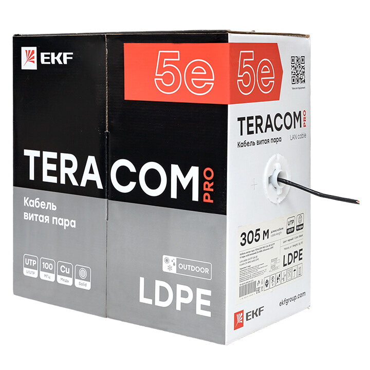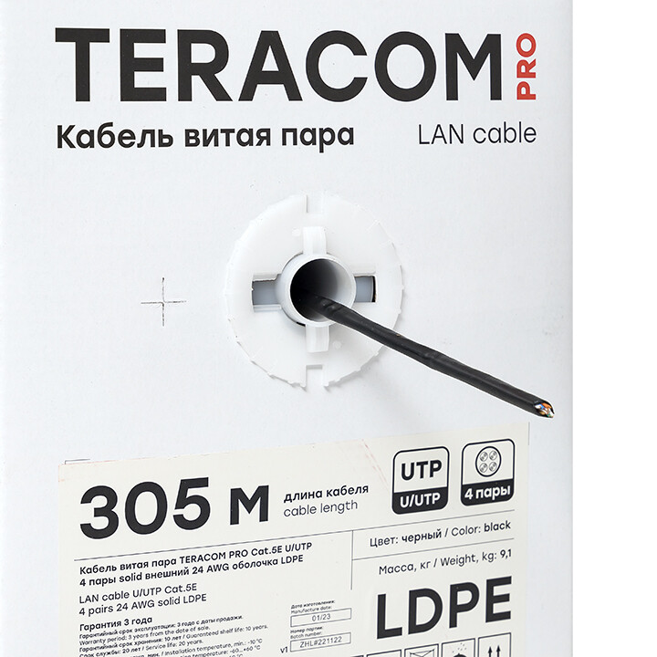 Кабель витая пара TERACOM Cat.5E U/UTP 4 пары solid внешний оболочка LDPE цвет черный (упак. 305м) (кр. 305м)