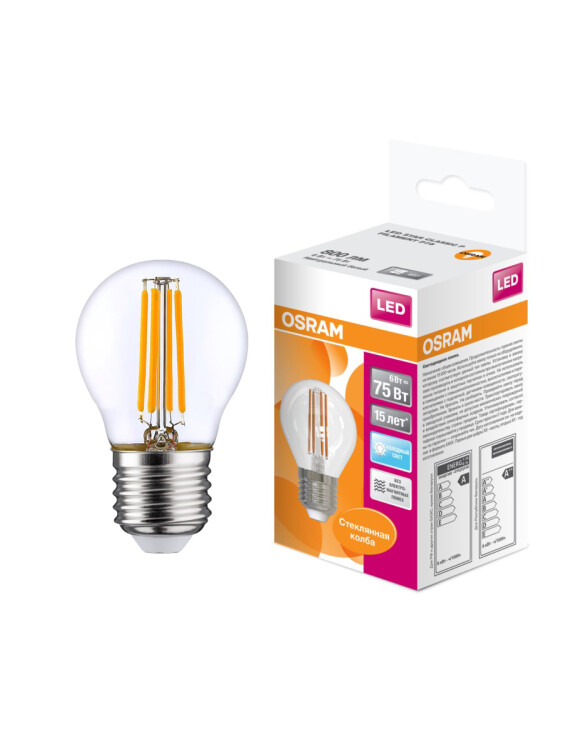 Лампа светодиодная филаментная OSRAM LED Star P, 800 лм, 6Вт (замена 75Вт), 4000K (нейтральный белый свет). Цоколь E27, колба P, угол пучка 300. Исполнение колбы прозрачное, стекло. Напряжение питания 220-240В. Товар сертифицирован