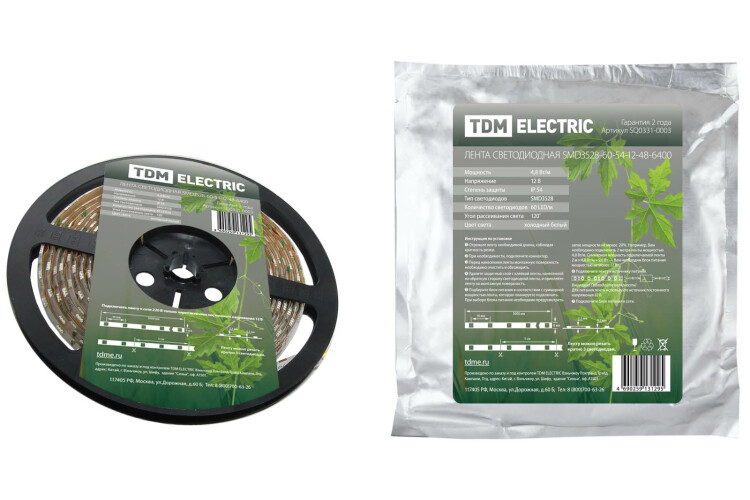 Применение:Для декоративной и функциональной подсветки. Подсветка витрин с ювелирными изделиями и торговых экспозиций. Декоративная подсветка мебели, торцевая подсветка стеклянных полок, баров, витражей и витрин. Контурная подсветка лестниц. Контурная подсветка рекламных букв и коробов. Освещение потолочных конструкций, ниш, интерьерных сооружений. Тюнинг автомобилей. Освещение холодильных и морозильных установок. Материалы:Гибкая медная плата. Клейкая лента 3М с высокими адгезивными свойствами. Световой поток светодиодного чипа SMD2835 5–6 лм, SMD5050 11–13 лм. Материал заливки (IP65) – полиуретан. Каждый отрезок 0,5 м промаркирован логотипом TDM ELECTRIC.Преимущества:Простота монтажа. Ленту можно резать кратно 3 светодиодам – для удобства на лицевой стороне ленты места отреза обозначены символом «Ножницы». На оборотной стороне ленты нанесен клеевой слой производства «3М» – мирового лидера в производстве клеевых материалов. Долгий срок службы. Применение качественных светодиодов, а также грамотный подбор резисторов гарантируют долгий срок службы (50 000 часов) и снижение светового потока не более чем 2% на каждые 1000 часов работы. Безопасность эксплуатации. Светодиодная лента работает от низкого напряжения 12 В, что абсолютно безопасно для человека. Безопасно для зрения – отсутствие пульсаций светового потока. Экологически безопасно – не содержит ртути, не требует специальной утилизации. Возможность использования при низких температурах. Для обеспечения степени защиты IP54 в герметичной ленте используется полиуретан – материал, который не теряет эластичности при низких температурах (до -40 ˚С). Удобство хранения. Светодиодная лента поставляется в фольгированных ZIP-пакетах, что предоставляет возможность длительного хранения отрезков ленты, защищая их от высыхания клеевого слоя, статического электричества, влажности и пыли. Гарантия качества. Каждый отрезок светодиодной ленты промаркирован знаком “TDM”, что гарантирует защиту от подделок. На светодиодную ленту предоставляется гарантия 2 года. 0: Применение:В качестве источника постоянного напряжения 12 В для использования внутри помещений с нормальной влажностью. Блоки питания со шнуром. Готовое решение для самостоятельно подключения светодиодной ленты с блоком питания имеют сетевую вилку и стандартный штырьковой разъём «папа» – выход постоянного напряжения 12 В.
