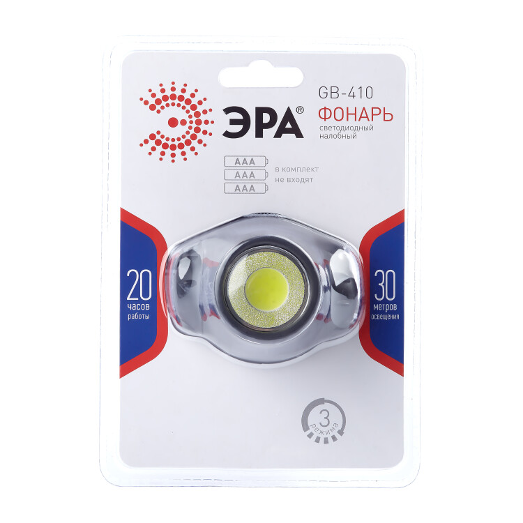 Фонарь налобный светодиодный ЭРА GB-410 на батарейках 3хААА, 3 режима, черный, IP44 (кр. 1шт)