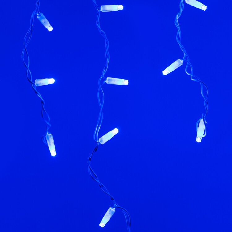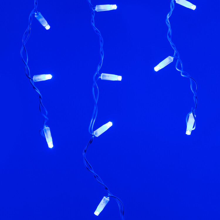 Светодиодная бахр ома Classic. Размер 2400x600 мм (длина 2400 мм, по длине 24 нити высотой 200/600 мм). Количество светодиодов 88 шт размером 7 мм. Цвет свечения СИНИЙ, эффект постоянного свечения с резким световым рисунком (прозрачная вогнутая линза). Провод белый, ПВХ. Питание 230 В, Мощность 6 Вт, защита IP65, применение на улице под навесом. Аксессуары для подключения приобретаются отдельно.