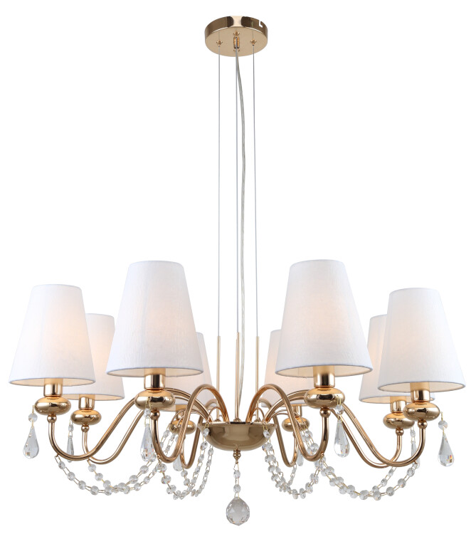 Цвет люстры Becky от итальянского бренда Rivoli – французское золото. Дизайн люстры интересен хрустальными подвесками и хрустальными бусами. Традиционные белые плафоны представлены в виде тканевых абажуров из специального немаркого материала. Люстры на тросах – популярное решение современного дизайна интерьеров, а классический стиль – всегда актуальное решение для оформления гостиной, спальни, ресторана, гостиницы, общественного пространства.