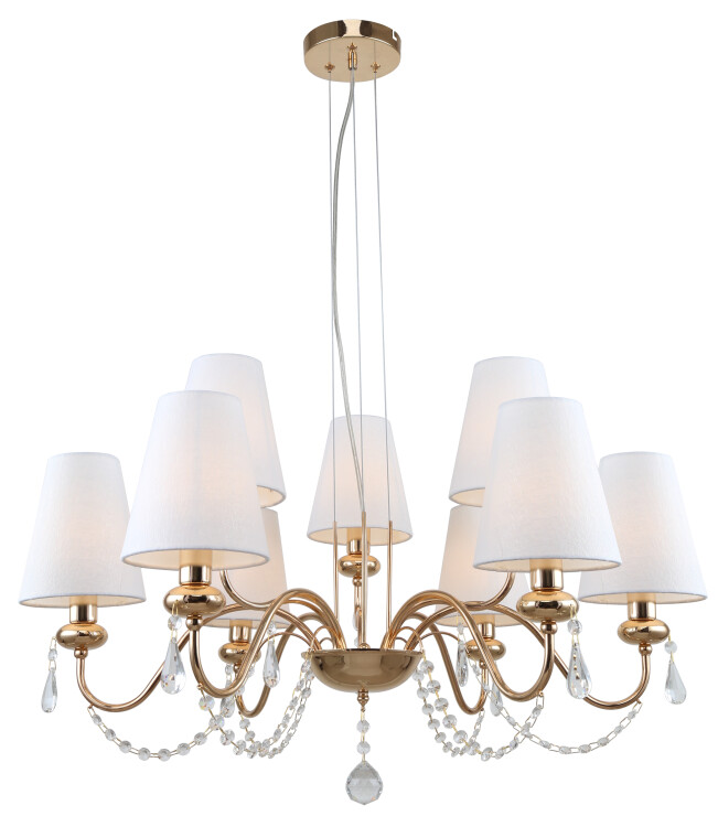 Rivoli Becky (арт. 2066-309) - люстра с 9 металлическими рожками под лампы Е14 40 Вт. Рожки люстры и корпус цвета французского золота декорированы хрустальными бусами и хрустальными каплями. Чистейший хрусталь с эффектной огранкой красиво пропускает свет, что делает данную люстру потолочную настоящим украшением интерьера. Тканевые белые плафоны создают уют. Материал плафонов-абажуров не накапливает грязь, легок в очистке.