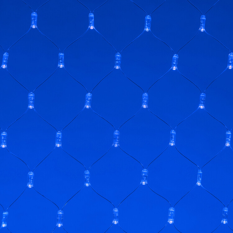 Светодиодная сеть Classic. 2000x1500 (длина 2000 мм, высота 1500 мм). Цвет свечения СИНИЙ. 288 светодиодов размером 7 мм со статическим и 8 динамическими эффектами свечения с резким световым рисунком (прозрачная вогнутая линза). Провод прозрачный, ПВХ. Питание 230 В, Мощность 18 Вт,защита IP65, применение в помещении и на улице под навесом Аксессуары для подключения и выбора режима свечения в комплекте.