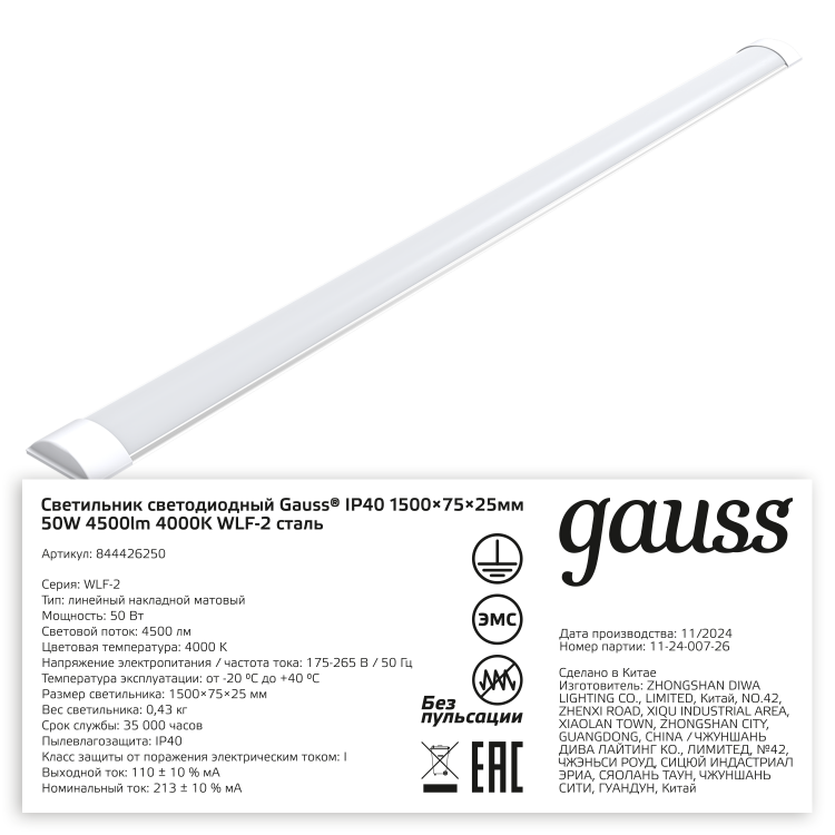 Светильник светодиодный матовый Gauss WLF-2 50w - это прекрасное бюджетное решение для освещения большинства зданий административного, коммерческого и жилого назначения, где он может быть использован для освещения основных помещений, а так же коридоров, гардеробных, лестничных площадок и других не требующих повышенной пылевлагозащиты зон. Сверхяркие светодиоды Sаnan снабжены алюминиевым радиатором, что повышает теплоотведение. У светильника стальной корпус, покрытый порошковой краской белого цвета и прочный рассеиватель из опалового пластика.