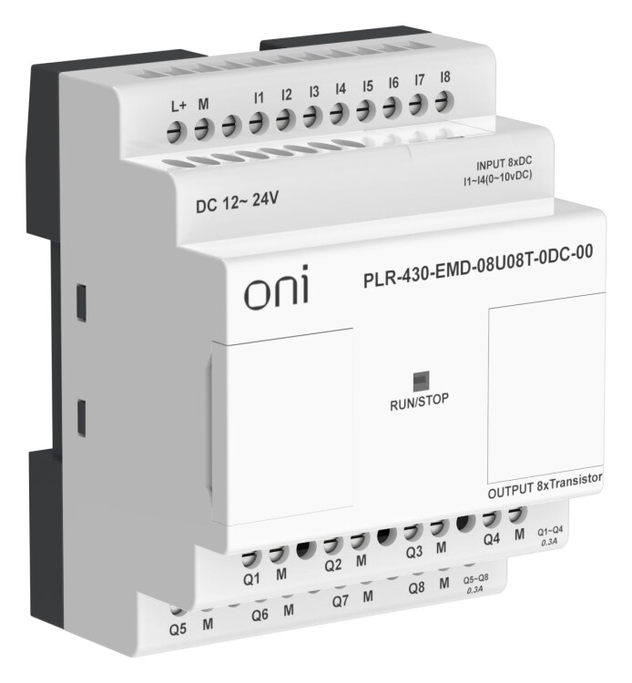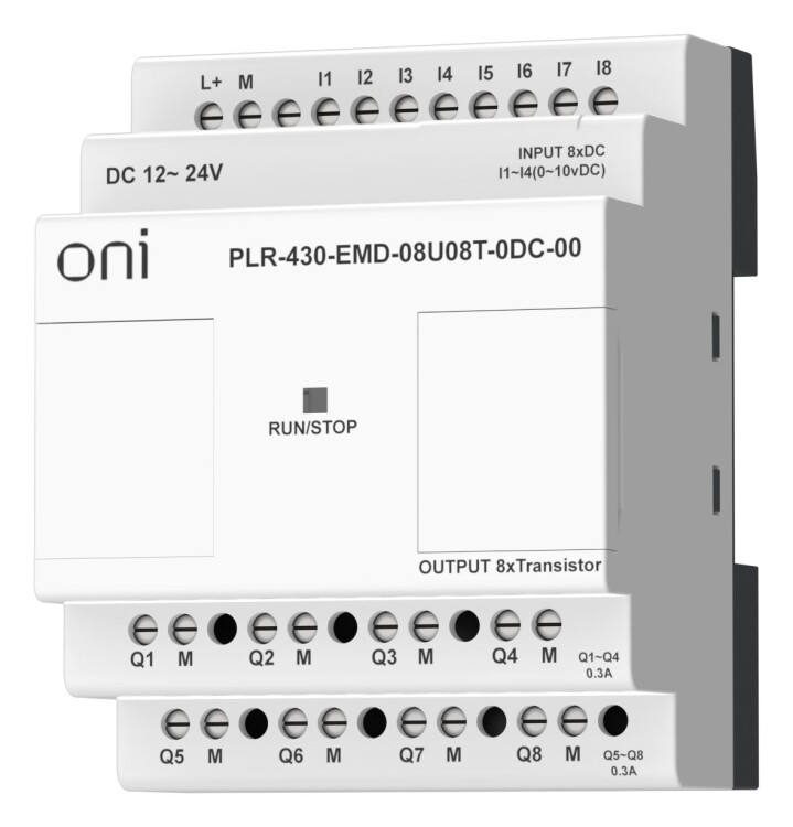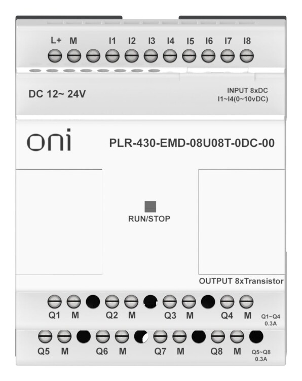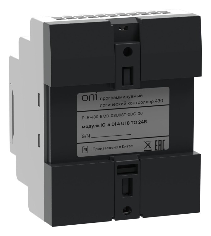 Модуль расширения входов-выходов для ПЛК 430 ONI. 8 дискретных входов, 4 из которых можно использовать как аналоговые 0-10В, и 8 транзисторных PNP выходов. Напряжение питания 24В DC.