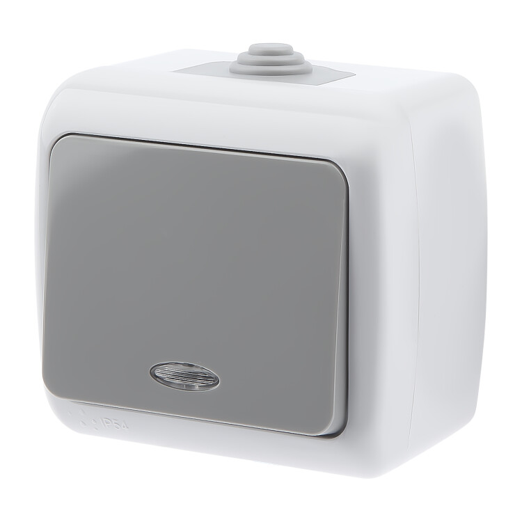 Выключатель Intro Atlantic 5-102-03 с подсветкой, 10А-250В, IP54, открытой установки, серый (кр. 1шт)