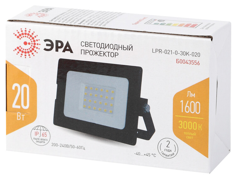 Прожектор светодиодный уличный (СДО) ЭРА LPR-021-0-30K-020 мощность 20 Вт, с цветовой температурой 3000К (теплый белый свет), пылевлагозащитой IP65 (защищен от пыли и струй воды с любого направления), световым потоком 1600 Лм. Корпус изготовлен из анодированного алюминия с покраской в черный цвет. Стекло - закаленное. LED технология обеспечивает длительный срок службы и экономию электроэнергии. Светильник работает в широком диапазоне рабочих напряжений - 200-240В, а также широком диапазоне температу от -40 до +45 - подходит как для внутреннего, так и наружного применения. Предназначен как для промышленного, так и для бытового освещения: дворов, подсобных помещений, приусадебных хозяйств, билбородов, в качестве уличного фонаря.