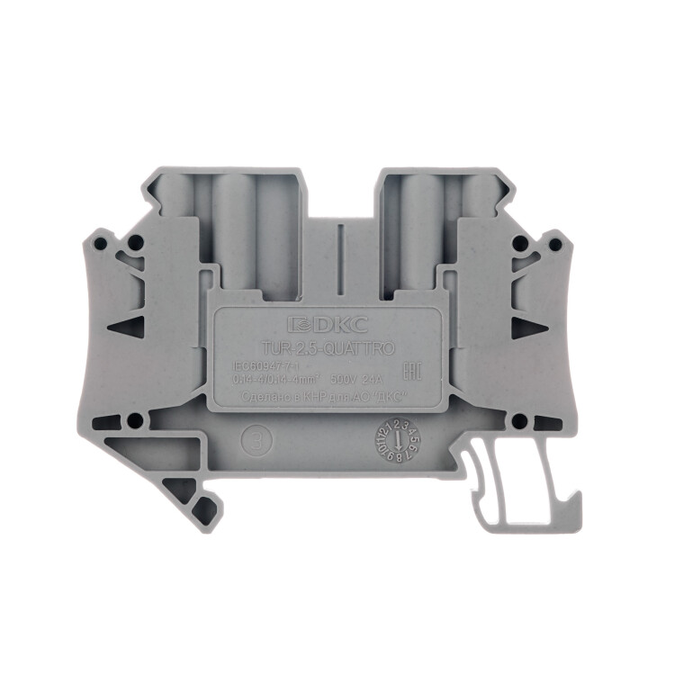 Серый цвет, 4 точки подключения, 2.5 мм². 2 канала для вставных перемычек. Габариты (В×Ш×Г) 47,5×65,4×5,2 мм.