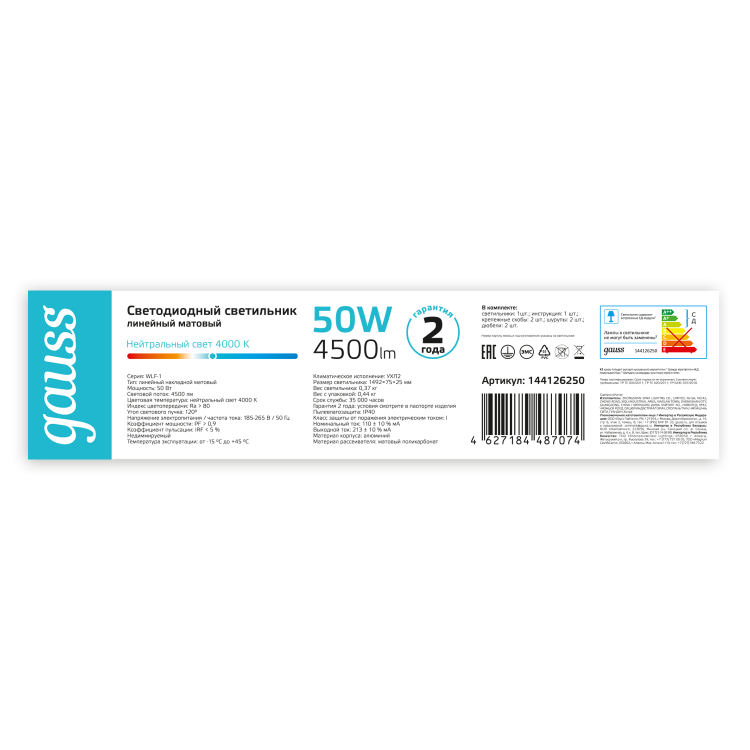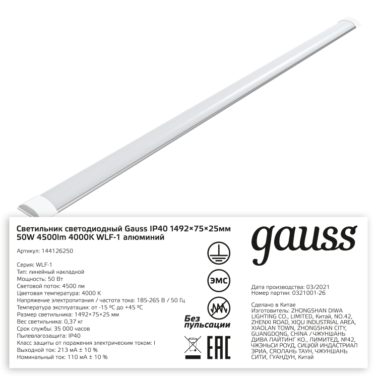 Светильник светодиодный матовый Gauss WLF-1 из анодированного алюминия с рассеивателем из опалового пластика мощностью 50w IP 20 подходит для любых сухих чистых помещений домашнего (коридоры, кухни, спальни) и общественного (магазины, офисы, подсобные помещения) назначения. Светильник оснащен сверхярким Sаnan LED светом со световым потоком 4500лм и цветовой температурой 4000К (нейтральный белый свет). У него простой накладной монтаж, бюджетная цена и высокий КПД.