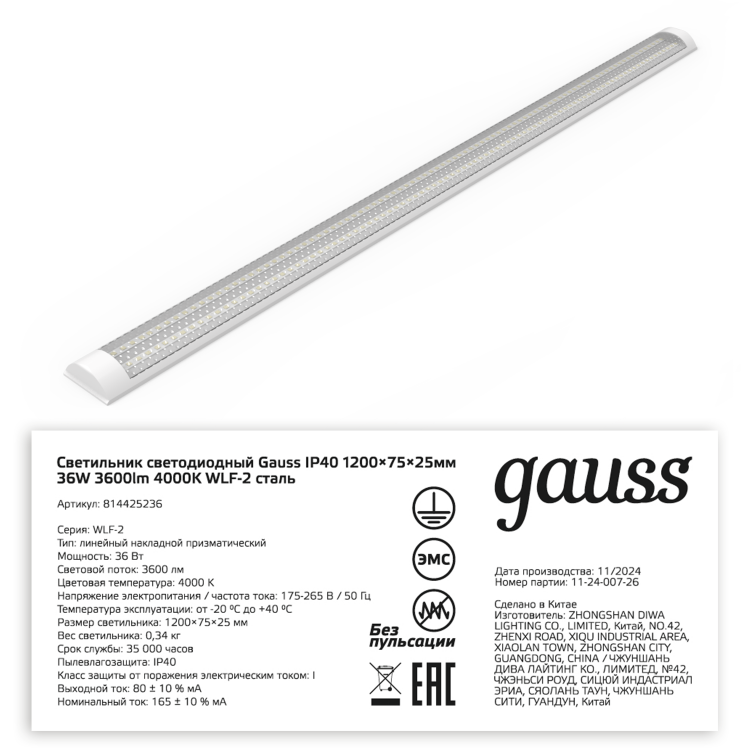 Светодиодный линейный светильник серии WLF-2 от Gauss – это бюджетное решение для общего освещения административных зданий, офисов, лестничных клеток, холлов, коридоров и межэтажных пространств. В данной модели используются светодиоды SANAN, которые смонтированы на алюминиевый модуль, что обеспечивает отличный отвод тепла на корпус. Благодаря рассеивателю из матового поликарбоната, светильник не пожелтеет и не рассохнется в течение всего срока службы. Материал корпуса светильника серии WLF-2 выполнен из стали, окрашенной белой порошковой краской.