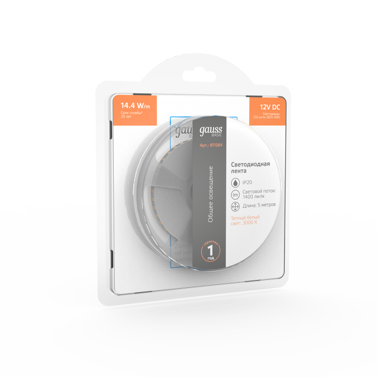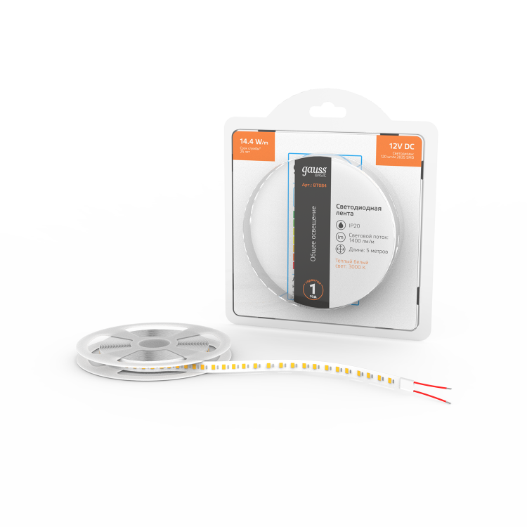 Лента Gauss Basic LED 2835/120 12V 14,4W/m 1400lm/m 3000K 8mm IP20 5m 1/100