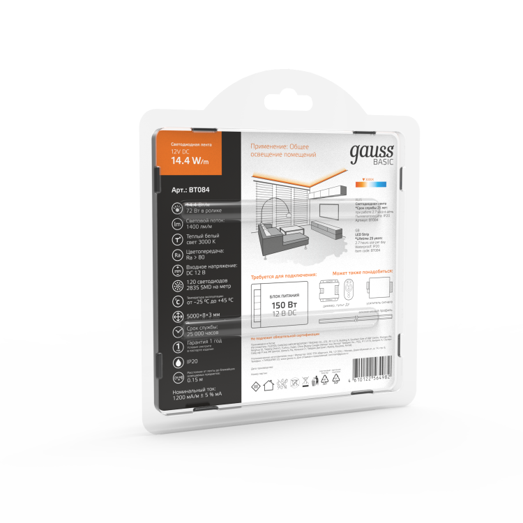 Ассортимент светодиодных лент Gauss способен решить ряд задач связанных как с декоративным освещением помещений, так и с экстерьерной подсветкой. Основой для ленты служит первичный силикон, без дополнительных примесей, что существенно увеличивает срок службы и помогает сохранить первоначальный вид на протяжении всего срока эксплуатации. Вариативный диапазон размещения количества светодиодов на метр позволяет использовать ленту для акцентной подсветки и для основного освещения. Высокий коэффициент CRI (> 80 ) обеспечит естественную цветопередачу. Профессиональные решения с высоким показателем светоотдачи лм/Вт.