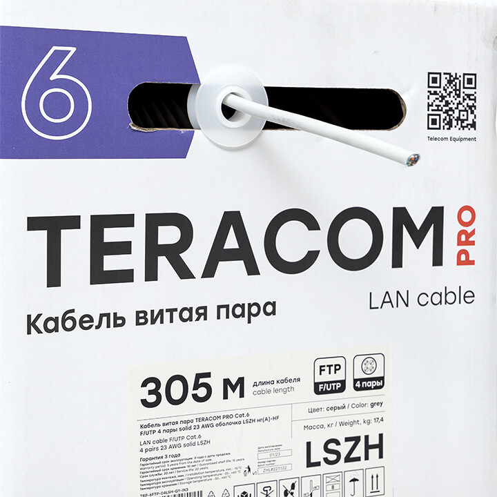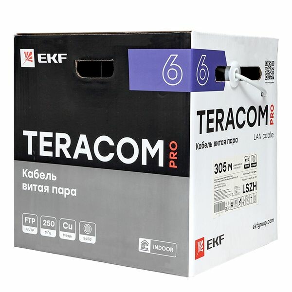 Витая пара – медные симметричные слаботочные кабели, проводники которых скручены между собой попарно для уменьшения перекрестных помех и предназначенные для передачи цифровой информации и данных при построении кабельных систем и сетей связи. В ассортименте TERACOM и TERACOM PRO в зависимости от скорости передачи данных и рабочей частоты представлены кабели от категории 5e до категории 6а в экранированном и неэкранированном исполнении. По типу внешней оболочки могут применяться как для внутренней, так и для наружной прокладки .Кабель витая пара категории 6 TERACOM PRO предназначен для передачи цифровой информации и сигналов в диапазоне частот 1–250 МГц при рабочем напряжении до 48 В.