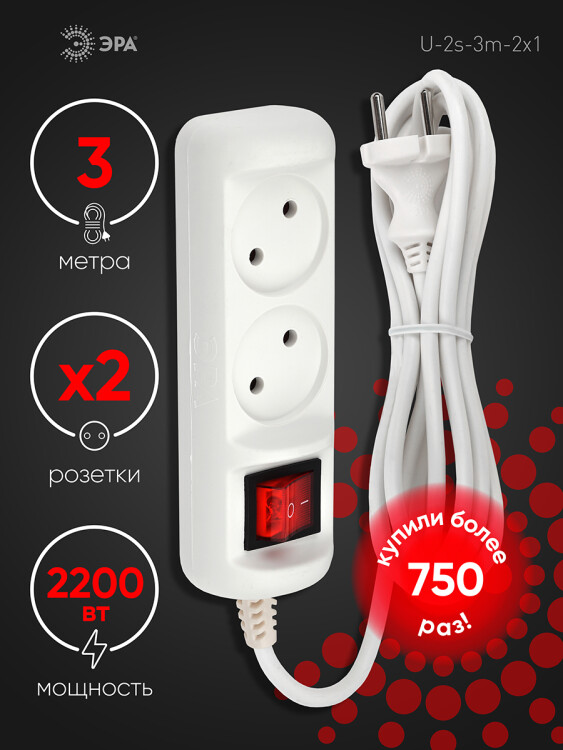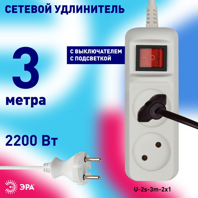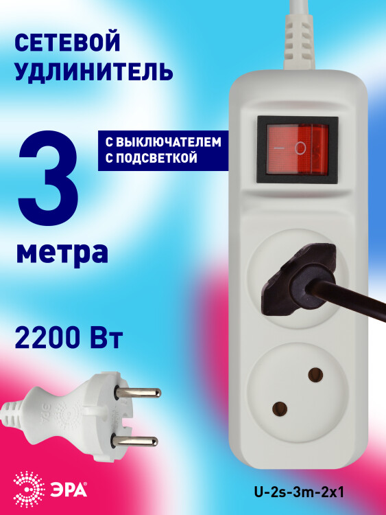 Удлинитель электрический Эра U-2s-3m-2x1 без заземления, с выключателем, ПВС, 2x1мм2, 2 розетки, 3м. Рассчитан на максимальную мощность 10А/2200 Вт. Удлинитель Эра станет Вашим надежным помощником, если Ваши любимые электроприборы находятся далеко от розеток. Провод в удлинителях Эра сделан из 100% меди, что делает его абсолютно пожаробезопасным. Корпус выполнен из ударопрочного и негорючего пластика (полипропилен). Модель удлинителя на 10А позволяет подключить бытовые приборы общей нагрузкой до 2200Вт. Дизайн удлинителя разработан в России командой Эра Style.