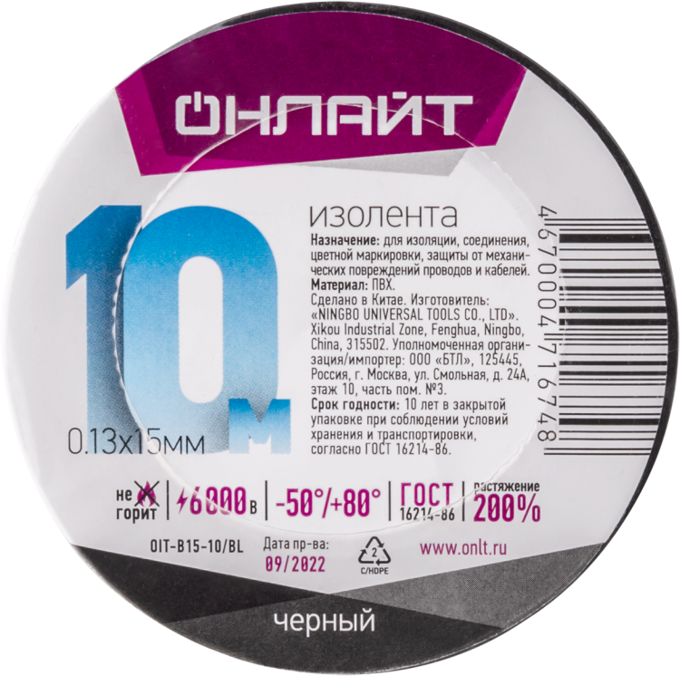 Изолента ОНЛАЙТ 71 674 OIT-B15-10/BL ПВХ черная (Китай)(кр.1шт)