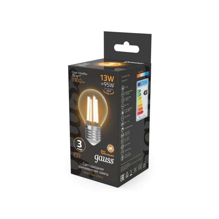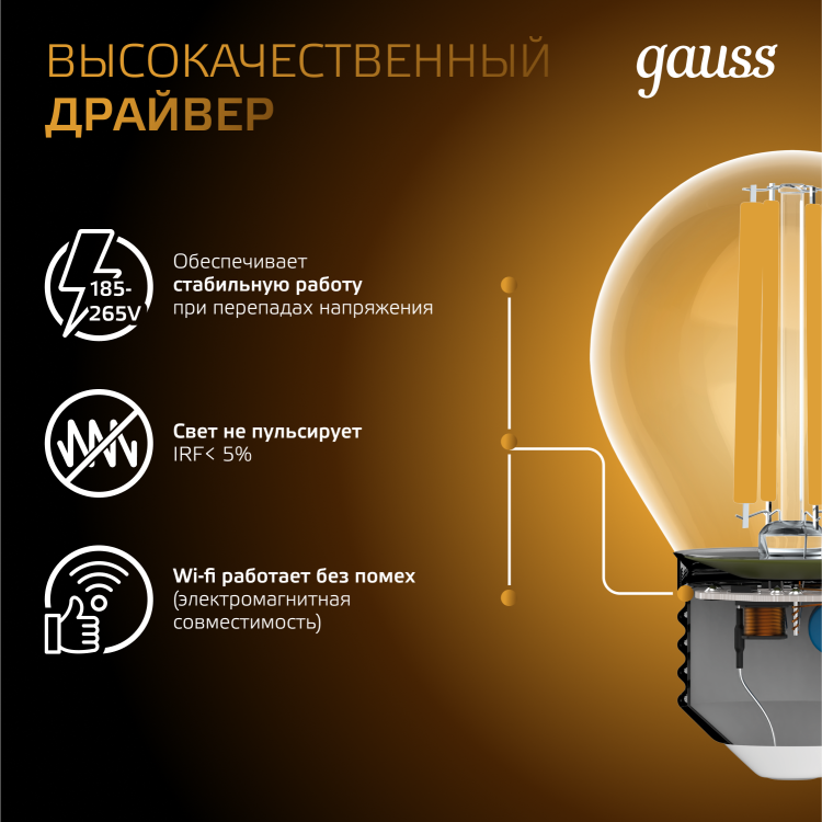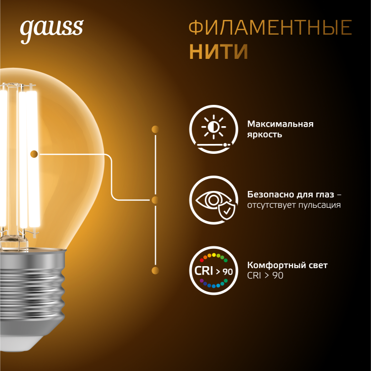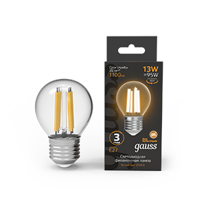 Светодиодные филаментные лампы GAUSS - это новейшие технологии в светотехнике. Лампы имеют привычный вид классических ламп накаливания, освещают пространство на 360о и дают больше света по сравнению с обычными светодиодными лампами за счет прозрачной колбы. Идеально подходят для хрустальных люстр и открытых светильников, а также для реализации дизайнерских решений, где важен вид классических ламп накаливания.