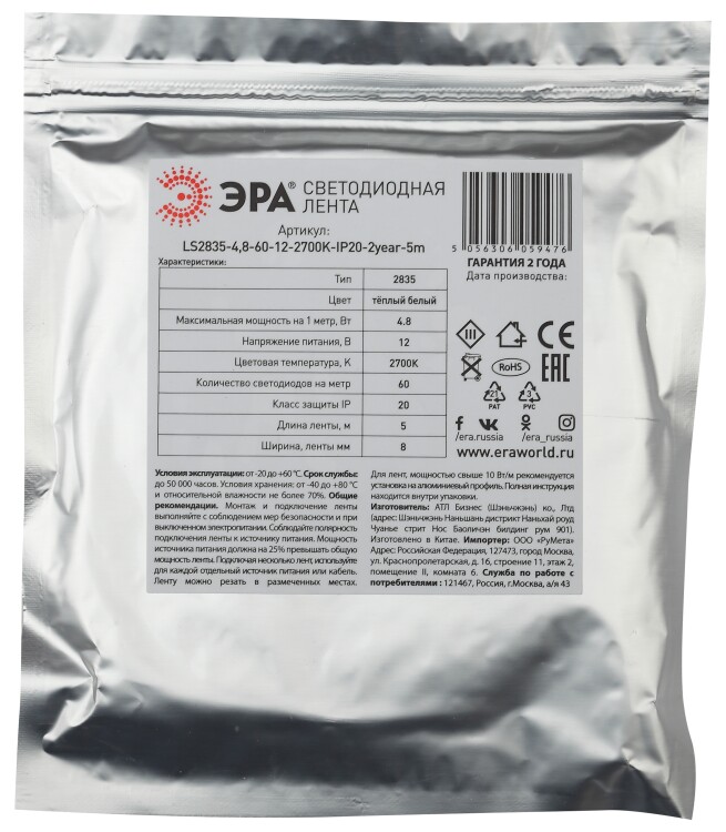 ЭРА Лента светодиодная LS2835-4,8-60-12-2700K-IP20-2year-5m (140/4200) со степенью защиты от пыли и влаги IP20 - современный способ создания внутреннего освещения, подсветки ниш, лестничного пространства, систем хранения, а также декоративного и художественного оформления любых объектов и форм в помещениях. Легко и быстро устанавливается на любой гладкой поверхности с помощью скотча, расположенного на оборотной стороне ленты. Используя алюминиевый профиль, можно создавать необычные и функциональные решения освещения в Вашем интерьере. Рабочее напряжение ленты составляет 12В, а мощность равна 4,8 Вт/м. Светодиодная лента обладает световым потоком 500 Лм/м, и цветом свечения - теплый белый (2700 K)