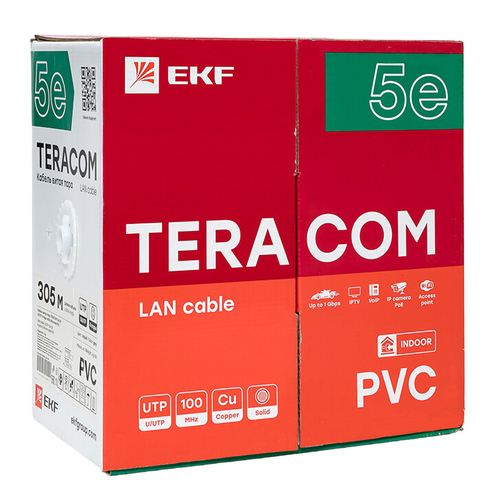 Витая пара – медные симметричные слаботочные кабели, проводники которых скручены между собой попарно для уменьшения перекрестных помех и предназначенные для передачи цифровой информации и данных при построении кабельных систем и сетей связи. В ассортименте TERACOM и TERACOM PRO в зависимости от скорости передачи данных и рабочей частоты представлены кабели от категории 5e до категории 6а в экранированном и неэкранированном исполнении. По типу внешней оболочки могут применяться как для внутренней, так и для наружной прокладки. Кабель витая пара категории 5E TERACOM (далее — кабель) предназначен для передачи цифровой информации и сигналов в диапазоне частот 1–100 МГц при рабочем напряжении до 48 В.