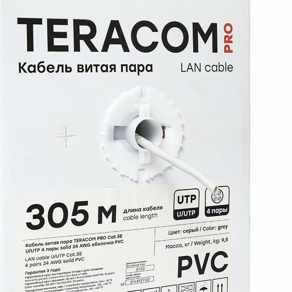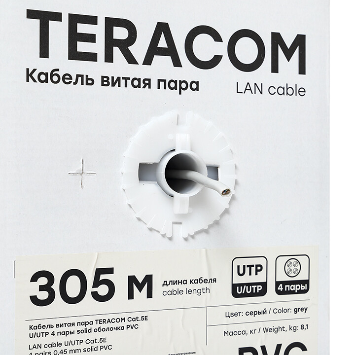 Кабель витая пара TERACOM PRO Cat.5E U/UTP 4 пары solid 24AWG оболочка PVC цвет серый (упак. 305м) (кр. 305м)