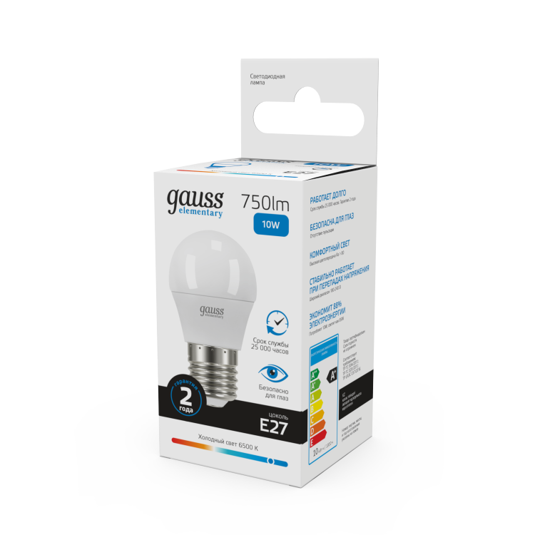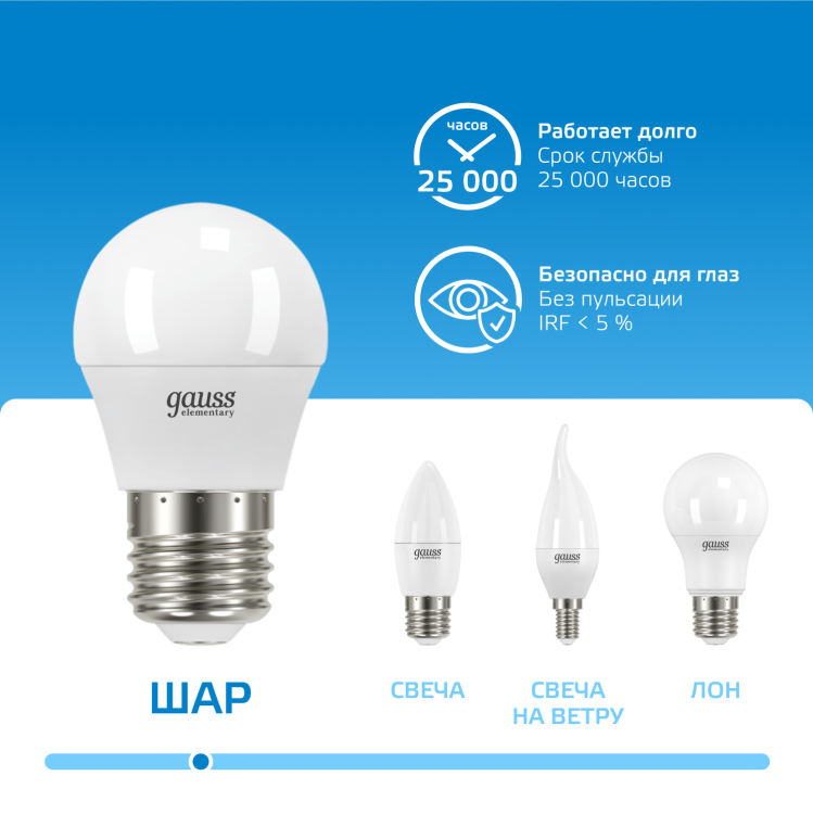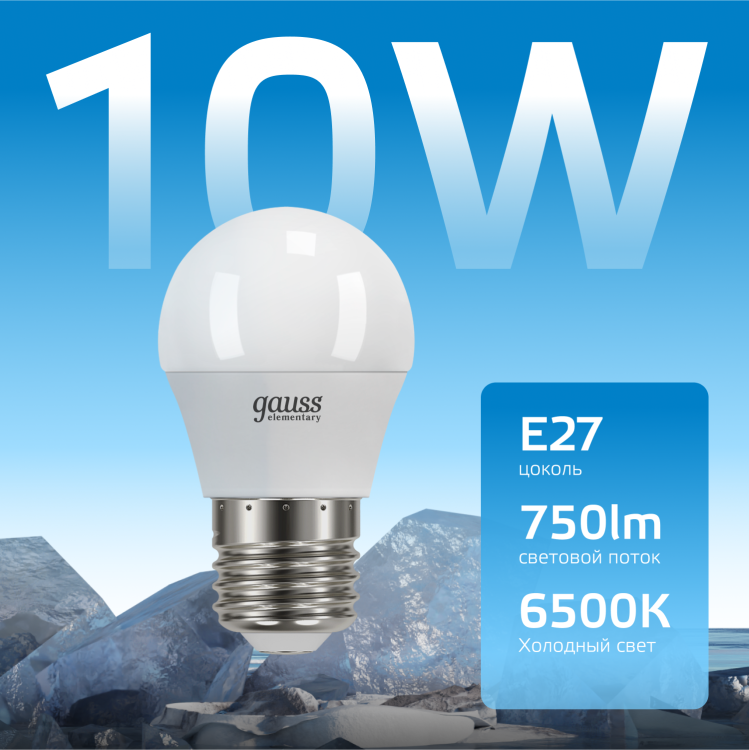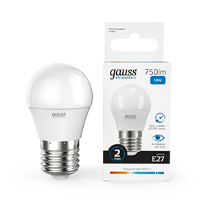 Лампы Gauss Elementary являются универсальными источниками света для любого типа помещений. Матовая колба ламп равномерно рассеивает свет и подходит для открытых светильников и прозрачных плафонов. За счет высокого индекса цветопередачи пространство будет наполнено приятным, мягкий светом, не слепящим глаза. В случае перебоя напряжений лампы не потеряют ярко сть и не будут мерцать.