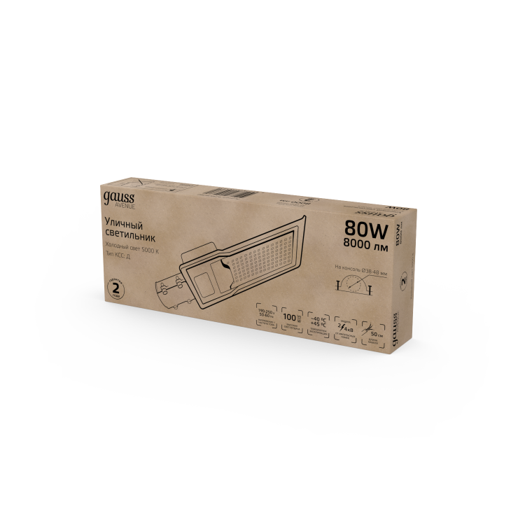 Светильник уличный Gauss LED Avenue G2 с ярким световым потоком 8000лм и цветовой температурой 5000К - это отличный осветительный прибор, который будет незаменим в освещении участков дорог, строительных объектов, дворов, спортивных площадок и других территорий нуждающихся в освещении в темное время суток. У светильника консольный тип крепления, прочный корпус из анодированного алюминия и высокая степень защиты от внешних факторов и импульсных помех.