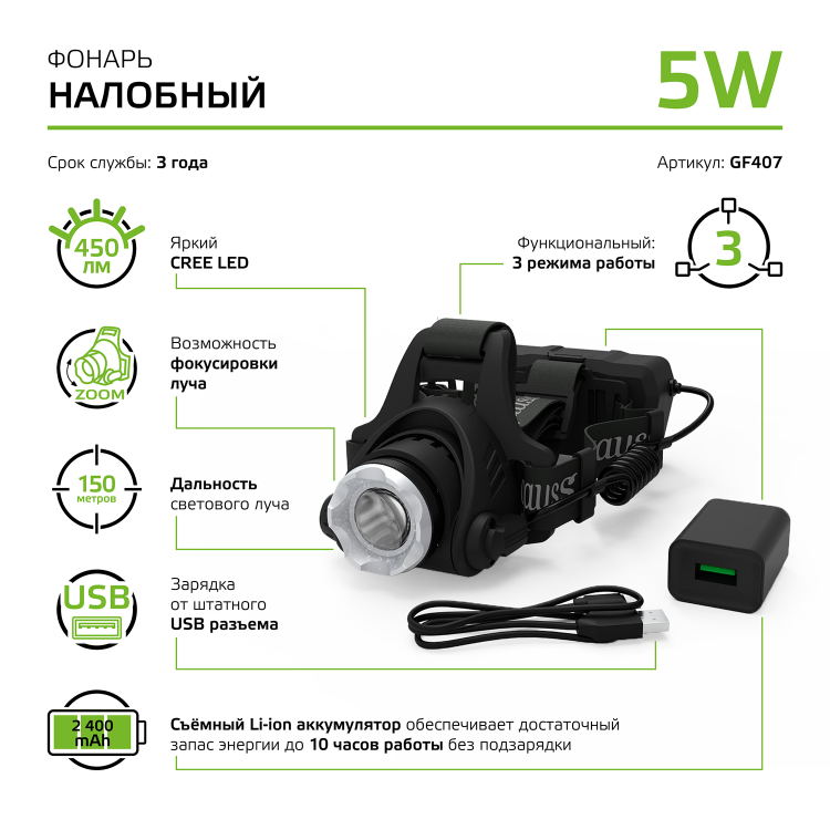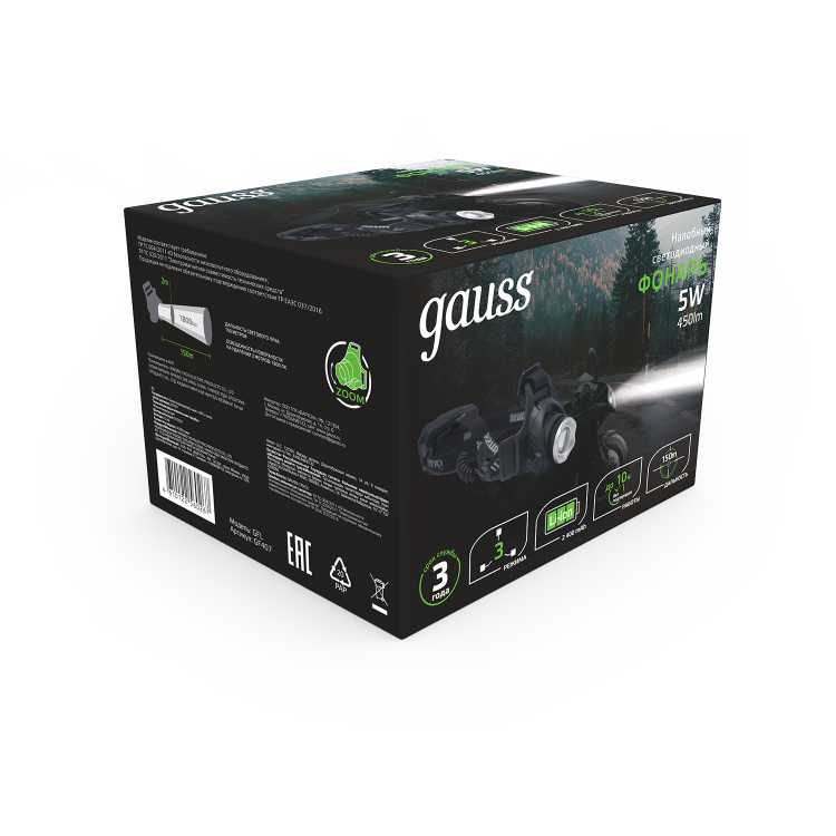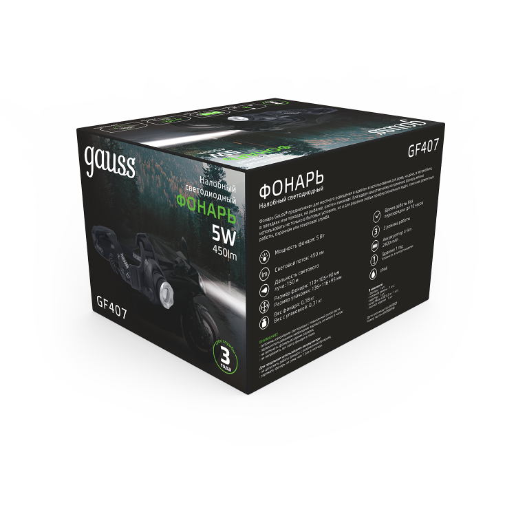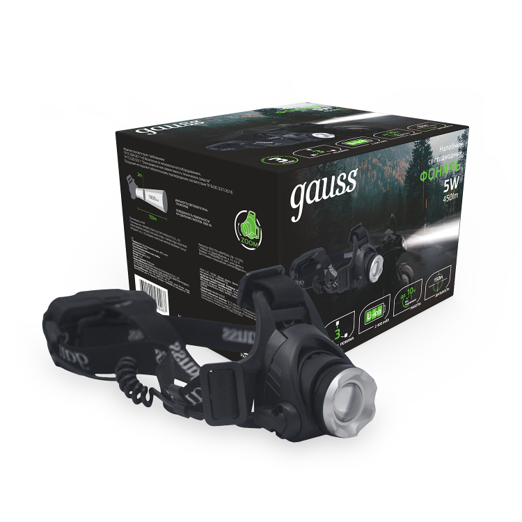 Фонарь налобный Gauss GFL407 с Cree led светодиодами, в металлическом корпусе и фокусировкой светового луча можно отнести к профессиональному оборудованию спасателей, спелеологов, службы охраны. У него прочная двойная фиксация регулируемым головным ремнем. 3 режима работы с максимальной дальностью светового луча до 150м и временем работы без подзарядки до 10 часов. Уровень защиты IP44 позволяет использовать фонарь как в сильно запыленных местах (завалы, работа в помещении с мелкодисперсной пылью, песчаная буря) так и в туманную и дождливую погоду под открытым небом. В полный комплект входит зарядное устройство для аккумулятора с USB шнуром.
