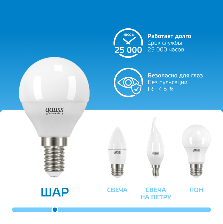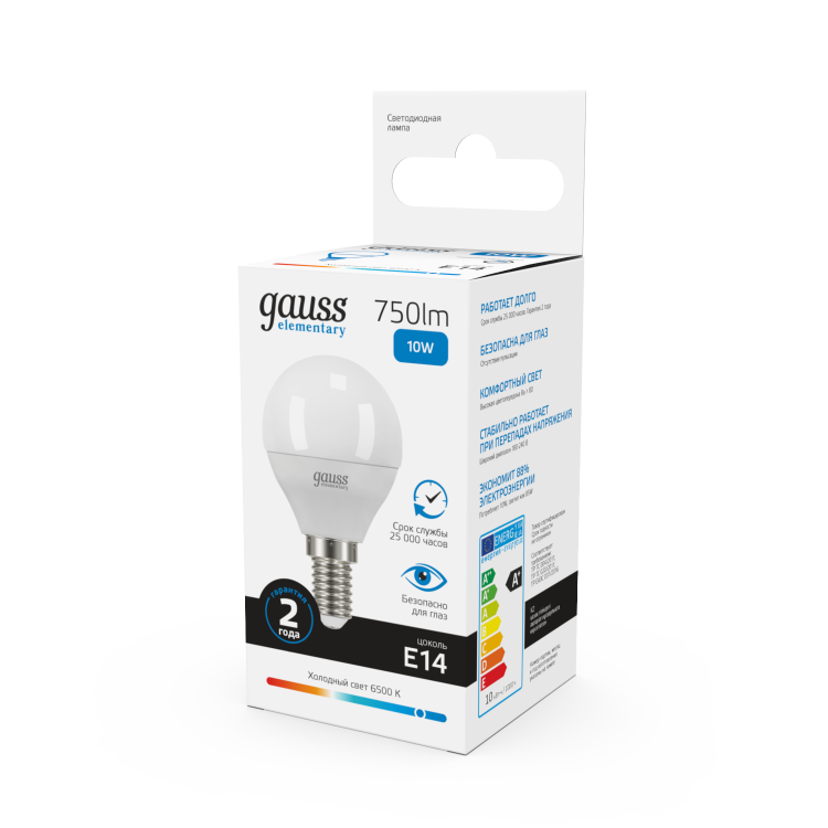 Лампы Gauss Elementary являются универсальными источниками света для любого типа помещений. Матовая колба ламп равномерно рассеивает свет и подходит для открытых светильников и прозрачных плафонов. За счет высокого индекса цветопередачи пространство будет наполнено приятным, мягкий светом, не слепящим глаза. В случае перебоя напряжений лампы не потеряют яркость и не будут мерцать.