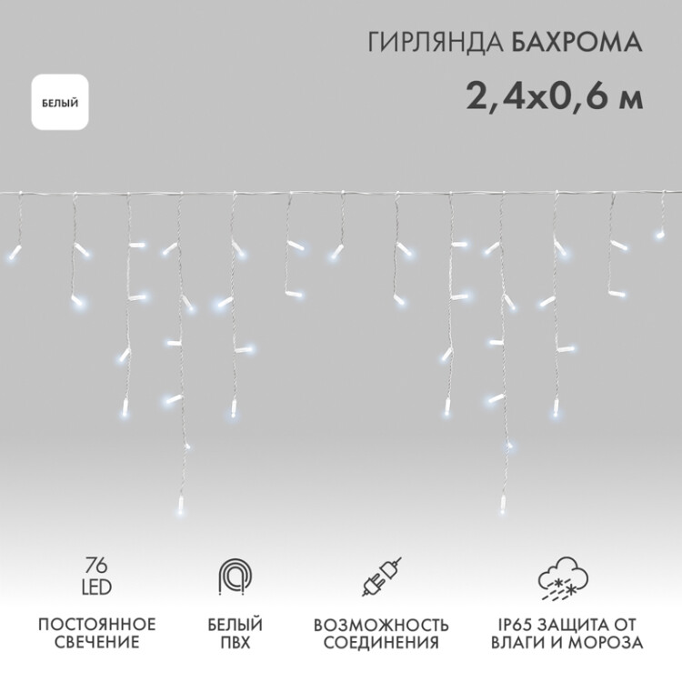 Гирлянда Айсикл (Баxрома) представляет собой гибкий горизонтальный шнур-шину, к которому через определенные промежутки крепятся вертикальные нити разной длины со светодиодами. Гирлянда имитирует сосульки и может послужить оригинальным решением при украшении карнизов, арок, фасадов зданий, витрин магазинов, а также стать эффектным элементом декора внутри помещений.Благодаря использованию светодиодов отличительной особенностью гирлянды является превосxодная яркость и низкое энергопотребление.При длине 2,4 м гибкая направляющая имеет 24 вертикальные нити от 20 до 60 см. Гирлянда имеет белый цвет свечения и предназначена для использования как внутри помещений, так и снаружи.