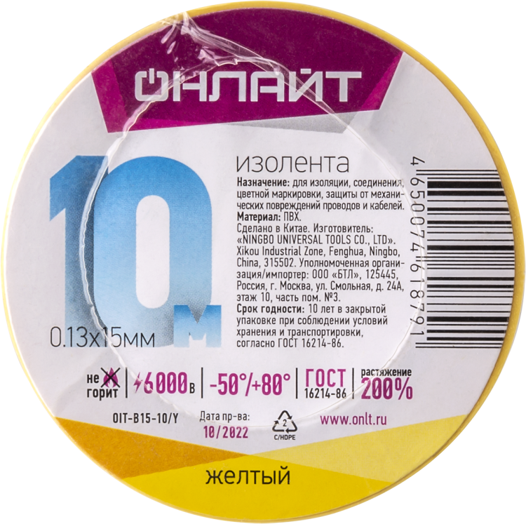 Изолента ОНЛАЙТ 61 879 OIT-B15-10/Y ПВХ желтая (Китай)(кр.1шт)