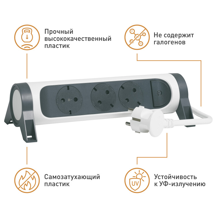 Корпус удлинителя выполнен из прочного немаркого высококачественного самозатухающего пластика, который не содержит галогенов и устойчив к ультрафиолетовому излучению. Всё это обеспечивает долговечное и безопасное использование удлинителя.