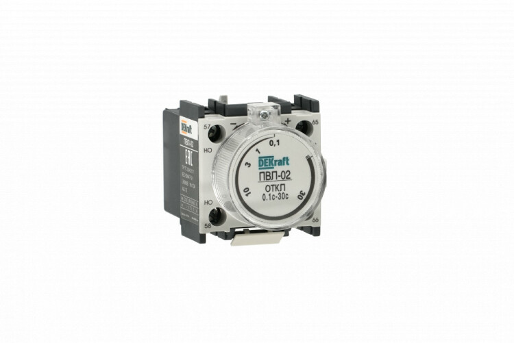 Приставка выдержки времени ПВЛ-02 для контакторов КМ-102 DEKraft; выдержка - 10…180 секунд; задержка - при отключении; ном.ток 10 А; ном.напряжение до 690 В; монтаж защелкой на контакторе; степень защиты IP20. Приставки выдержки времени позволяют получить задержку замыкания или размыкания контактов цепи управления, например, в схема включения двигателя «звезда/треугольник; или для обеспечения паузы между циклами технологического процесса.