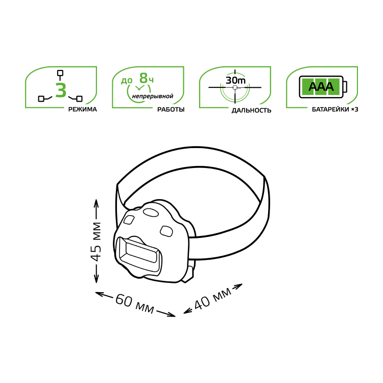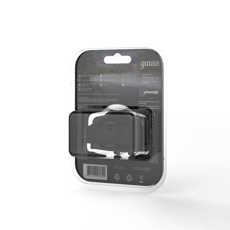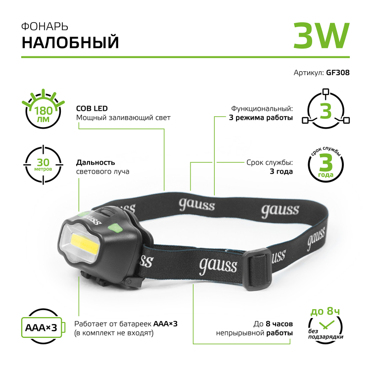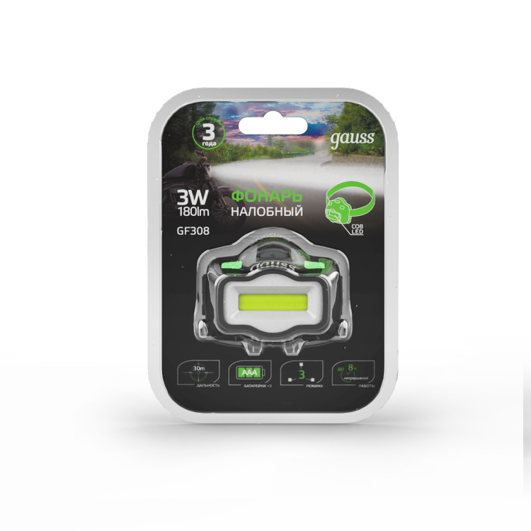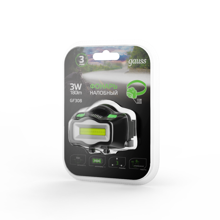 Фонарь налобный Gauss GFL308 удобный и надежный в использовании. Фиксируется прочным эластичным регулируемым головным ремнем, подходит для эксплуатации в сильно запыленных помещениях и под моросящим дождем. В фонаре установлены сверхмощные светодиодные чипы COB Led. Дальность светового луча достигает 30м, освещенность поверхности на расстоянии 2 метра - 22лм. Непрерывная работа до 8 часов, питание 3 батарейки ААА, 3 режима работы. Виды деятельности, для которых фонарь будет незаменим: туризм, велотуризм, спелеология, рыбалка, ремонтные и авторемонтные работы.