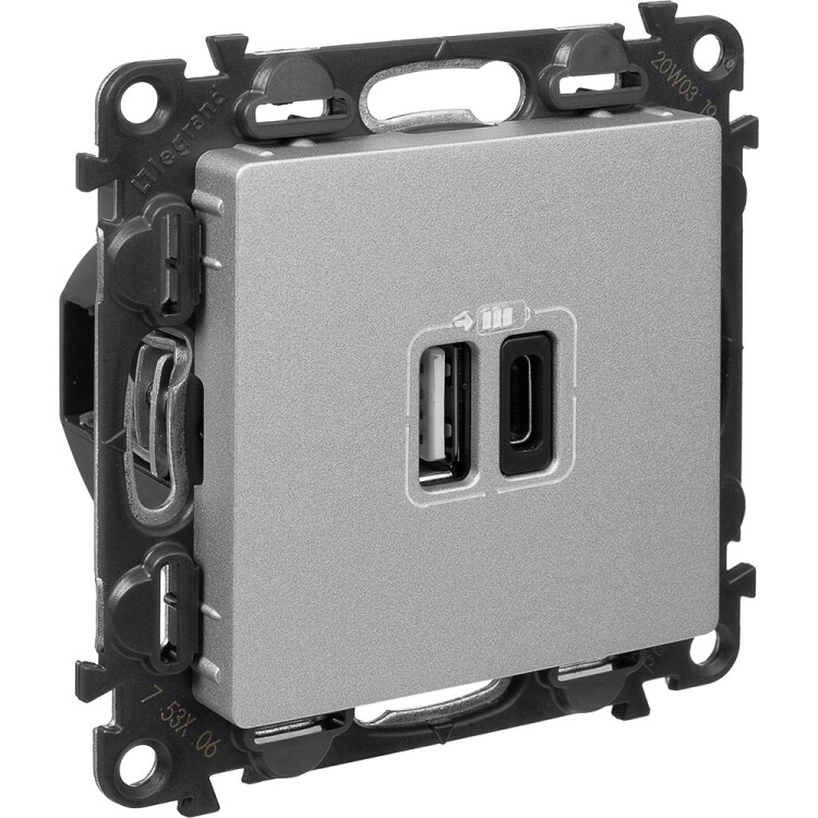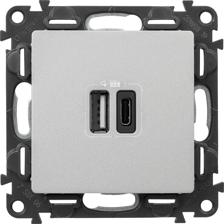 Valena LIFE.Зарядное устройство с двумя USB-разьемами тип A-тип С 240В/5В 3000мА.С лицевой панелью.Цвет Алюминий