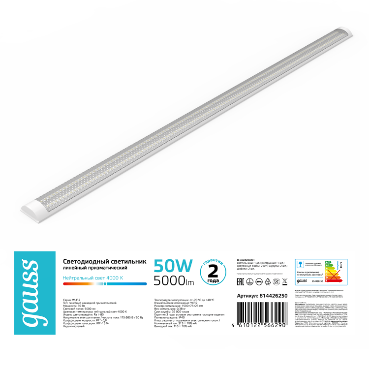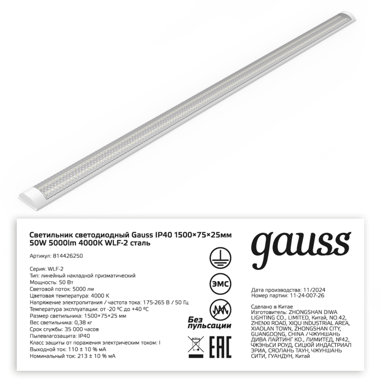 Светодиодный линейный светильник серии WLF-2 от Gauss – это бюджетное решение для общего освещения административных зданий, офисов, лестничных клеток, холлов, коридоров и межэтажных пространств. В данной модели используются светодиоды SANAN, которые смонтированы на алюминиевый модуль, что обеспечивает отличный отвод тепла на корпус. Благодаря рассеивателю из матового поликарбоната, светильник не пожелтеет и не рассохнется в течение всего срока службы. Материал корпуса светильника серии WLF-2 выполнен из стали, окрашенной белой порошковой краской.