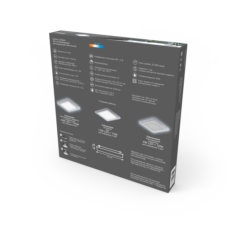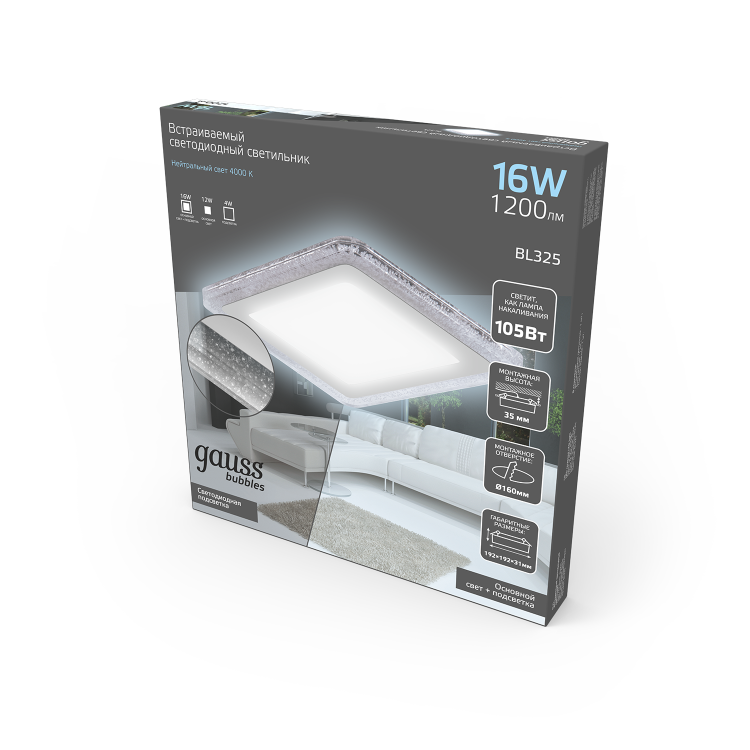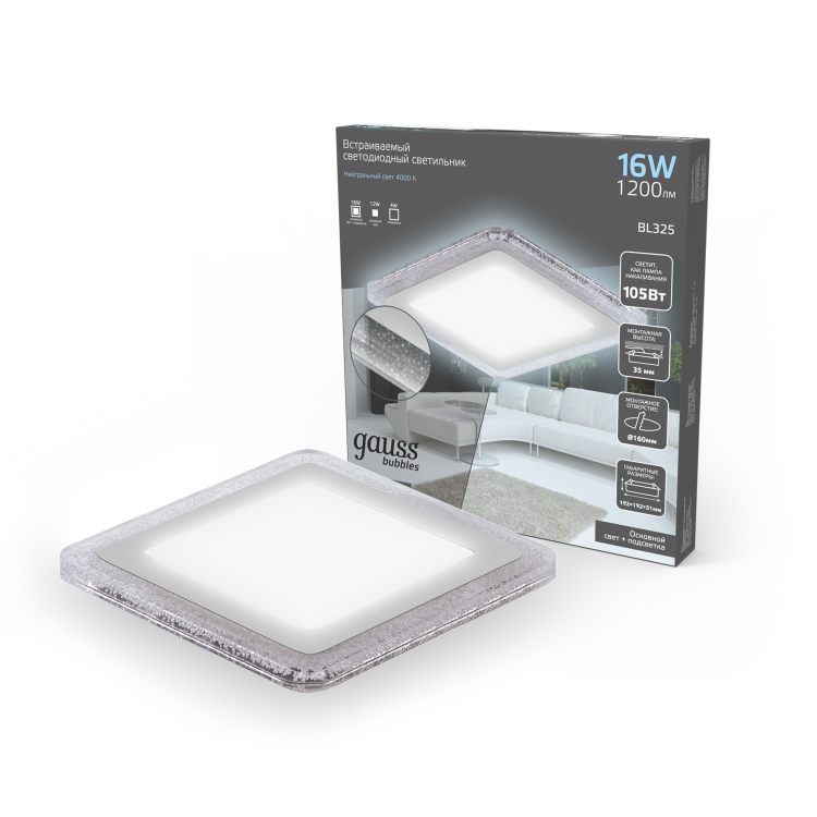 Светильник Gauss Bubbles встраиваемый BL325 форма - квадрат; цвет корпуса - белый с рисунком в виде полупрозрачных пузырьков. Светильник выглядит элегантно, может использоваться соло - в качестве основного освещения для небольших комнат или как дополнительное освещение, а так же в группе с центральной люстрой или без нее. Общая мощность составляет 16 w, что соответствует лампе накаливания 105w. У светильника 3 световых режима: основной - лампа 12w, дополнительный - светодиодная лента 3w и оба: лампа + подсветка. Пылевлагозащита IP20 позволяет использовать светильник в сухих комнатах, таких как гостинная, спальня, столовая, кухня, коридор, кабинет, при хожая.