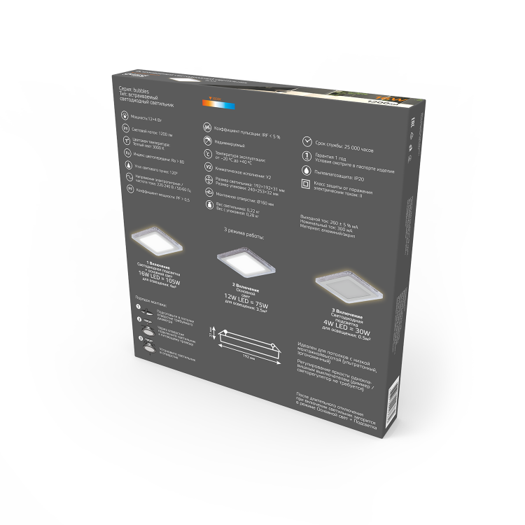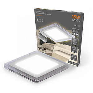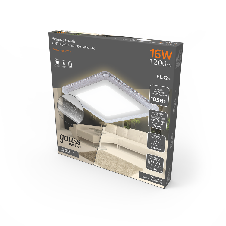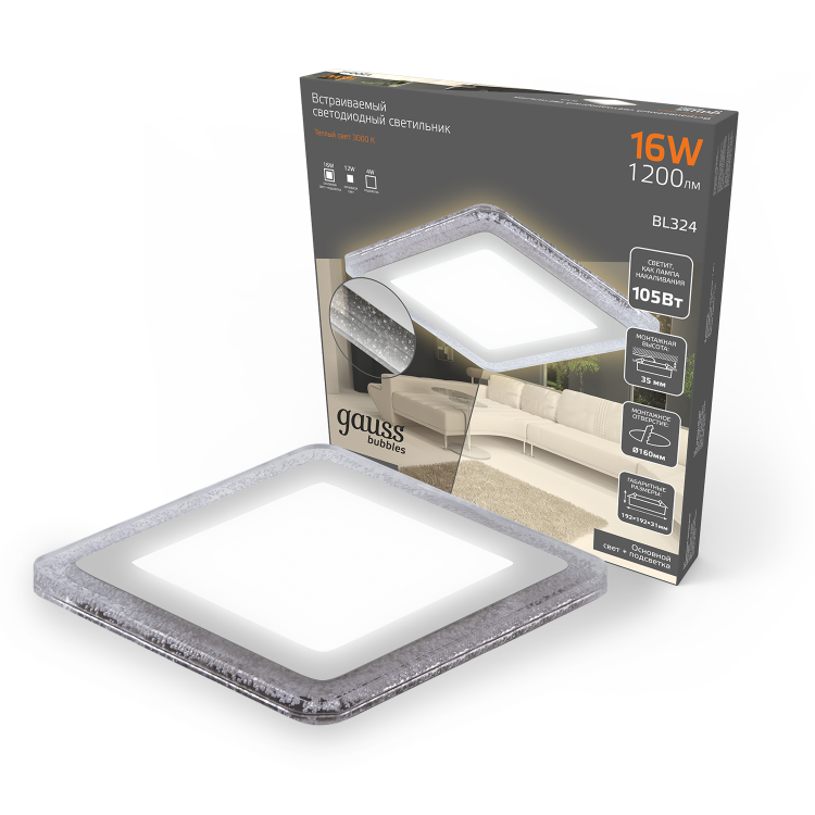 Светильник Gauss Bubbles встраиваемый BL324 форма - квадрат; цвет корпуса - белый с рисунком в виде полупрозрачных пузырьков. Светильник имеет три режима работы - основной, подсветка или оба включены одновременно. Общая мощность составляет 16 w (12+4w). Яркость общего светового потока 1200лм теплого 3000К белого света. У светильника небольшая монтажная глубина, что позволяет его использовать на невысоких потолках. Уровень пылезащиты подходит только для сухих помещений. Материалы корпуса - алюминий, акрил.