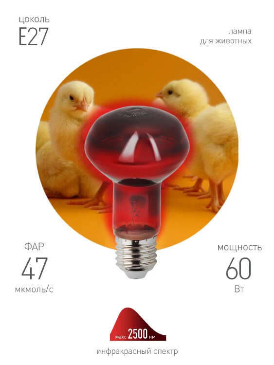 Инфракрасная лампа ЭРА ИКЗК 230-60 R63 для обогрева животных 60 Вт Е27 с красной колбой активно используется в животноводстве, птицеводстве и растениеводстве. Максимальная тепловая мощность без яркого света. Идеальна для стабилизации теплового баланса новорождённых и молодых животных. 100% энергии переходит в тепловую. Работа лампы не зависит от скачков сети, микроимпульсов. Не требуются стабилизаторы напряжения, лампа работает даже при пониженном напряжении. Мгновенно включается и нагревается. Минимум пульсаций освещения. Компактные размеры.