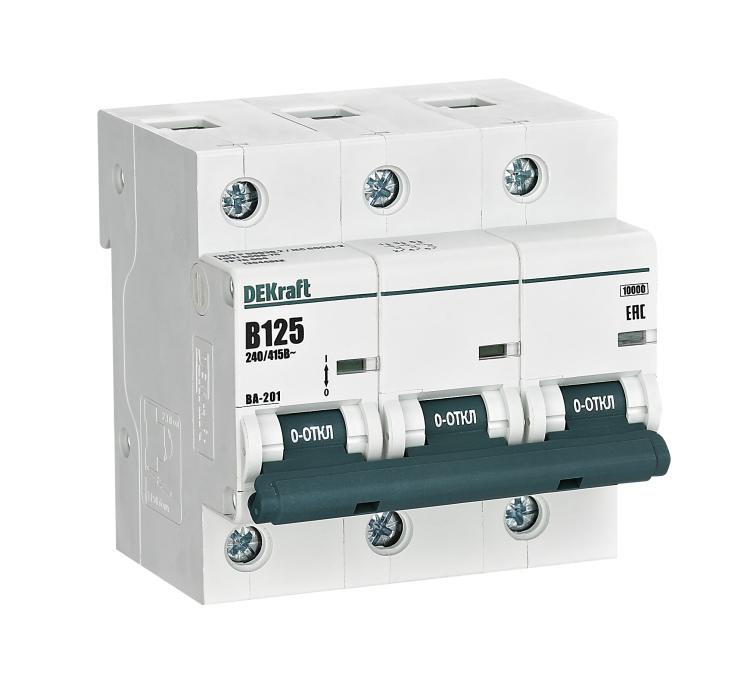 Автоматический выключатель серии ВА-201 Dekraft; 3P; номинальный ток 125 А; характеристика B; отключающая способность 10 кА; ширина модуля 81мм. Монолитная лицевая панель обеспечивает безопасную эксплуатацию аппарата. Окошко-индикатор всегда показывает состояние аппарата вне зависимости от положения рукоятки управления. Двухпозиционная защелка облегчает монтаж выключателя. Аппарат на 100% совместим с корпусами и оболочками Dekraft, Systeme Electric.