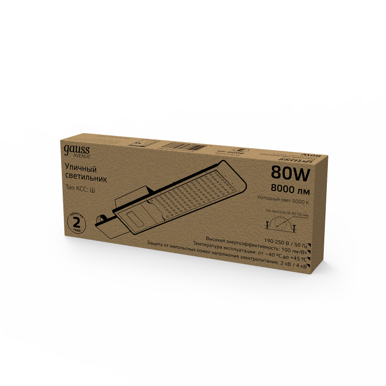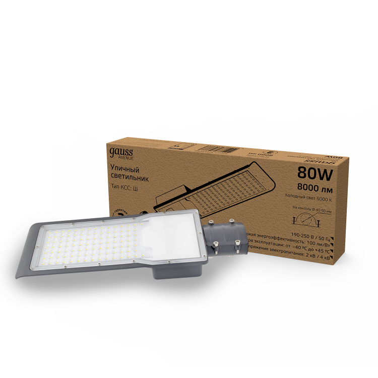 Светильник уличный Gauss LED Avenue - это яркий LED светильник консольного типа с высоким уровнем защиты от внешних среды IP 65 и широкой КСС, который отлично справится с освещением участков дорог, дворов, парков, территории дачи, строительных объектов, спортивных площадок. У светильника холодный белый свет 5000К, яркость диодов в совокупности составляет 8000лм. Корпус изготовлен из алюминия, с прозрачным рассеивателем. Светильник надежно защищен от импульсных помех и перепадов напряжения сети.