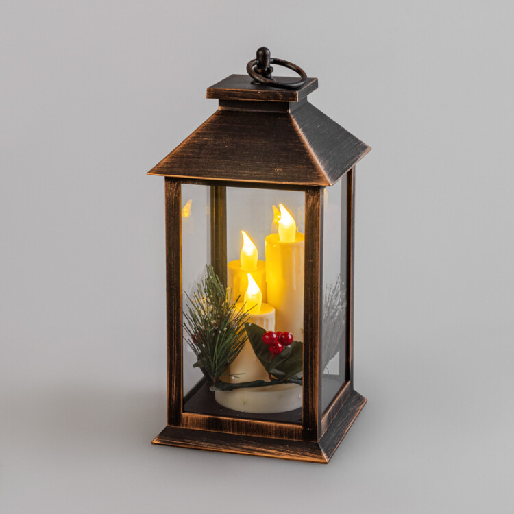 Декоративный фонарь со свечками символизирует уют и домашнее тепло. Изделие станет прекрасным украшением праздничного и повседневного интерьера, подарит ощущение комфорта в зимний вечер. Главное преимущество светодиодного фонаря - безопасность использования: светодиод не нагревается - не может повредить окружающие предметы и нанести ожоги при прикосновении. Фигурка имитирует горение аутентичной свечи, отбрасывая мягкие эффектные тени. Фонарь питается от 3 батареек тип ААА и имеет клавишу ON/OFF.