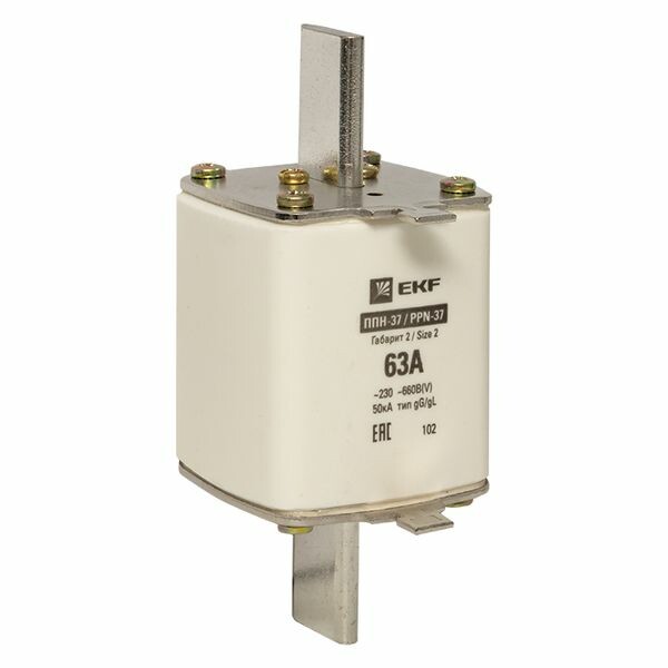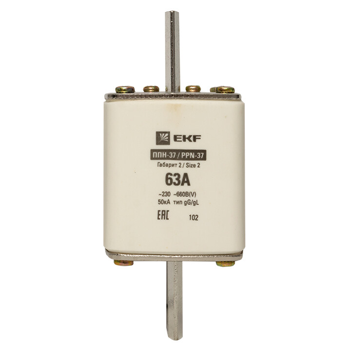Плавкая вставка ППН-37 400/63А габарит 2 EKF. Предохранители плавкие ППН EKF, укомплектованные плавкими вставками типа gG/gL, предназначаются для защиты кабельных линий и промышленных электроустановок от токов перегрузки и короткого замыкания. Предохранители применяются в электрических сетях переменного тока частотой 50 Гц с напряжением до 660В. Применяются для крепления в распределительных и вводно-распределительных устройствах. Предохранители плавкие ППН могут устанавливаться в основание с держателем, а также в специально предназначенные рубильники. В комплект поставки предохранителей плавких ППН основание с держателем не входит и п риобретается отдельно.