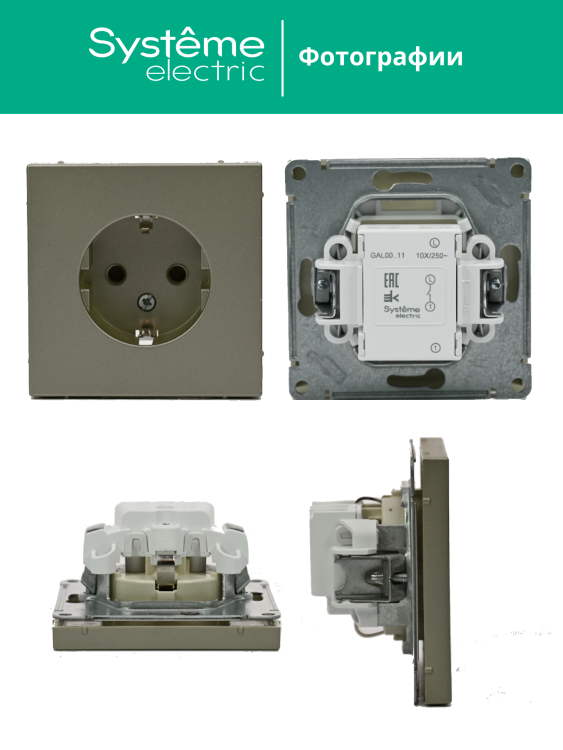 Механизм Systeme Electric серии ArtGallery в цвете шампань розетки одинарной с заземлением и без шторок подходит для сетей 250 В, на ток 16 А.