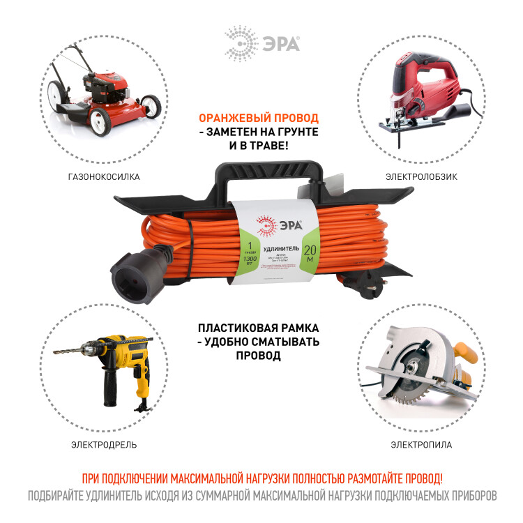 Удлинитель силовой на рамке UFx-1-2x0.75-20m на рамке без заземления 1 розетка, 20м ПВС 2x0.75мм2, степень защиты IP20. Мощность 6А/1300Вт. Используется для работы на строительных площадках или дачных участках. Удобен при работе с приборами находящимися удаленно от стационарной розетки. Например, газонокосилки, электрические, пилы, триммеры или электродрели. Провод в удлинителях Эра сделан из 100% меди, что делает его абсолютно пожаробезопасным. Рама-полипропилен.