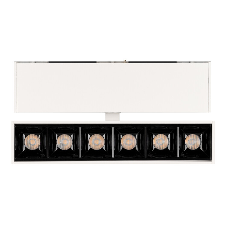 Светильник поворо тный для магнитных треков шириной 45мм, 6Вт. Цвет свечения ТЕПЛЫЙ 3000K, световой поток 400лм, угол 15°, CRI>90. Корпус прямоугольный, металл, цвет белый, IP20. Размеры LxWxH 163x35x92.5мм. Входное напряжение DC24V, мощность 6Вт. Драйвер DС24V/AC230V поставляется отдельно. Диммируется только с 026407(1), 027633.