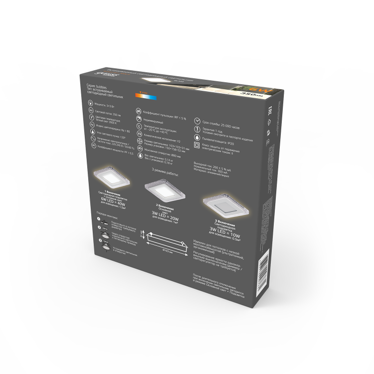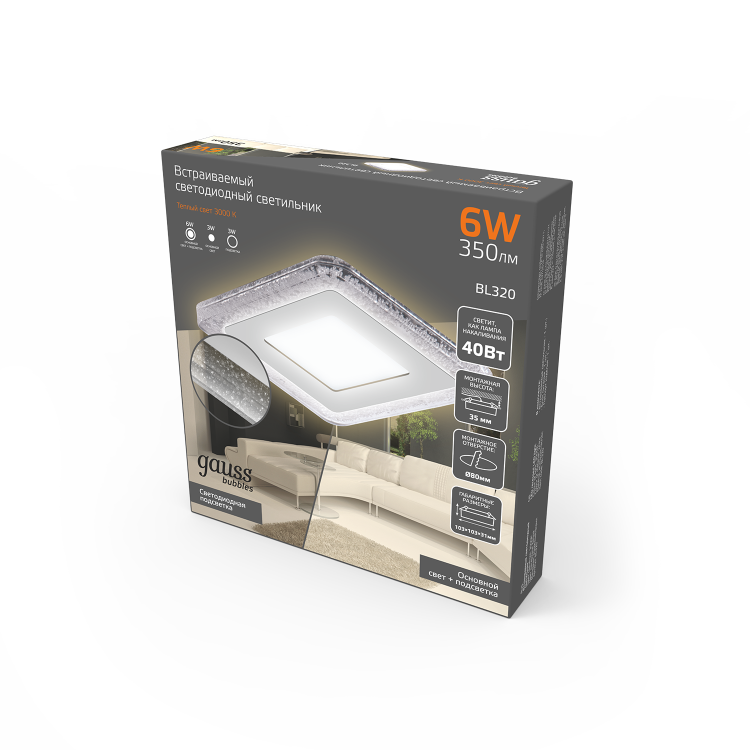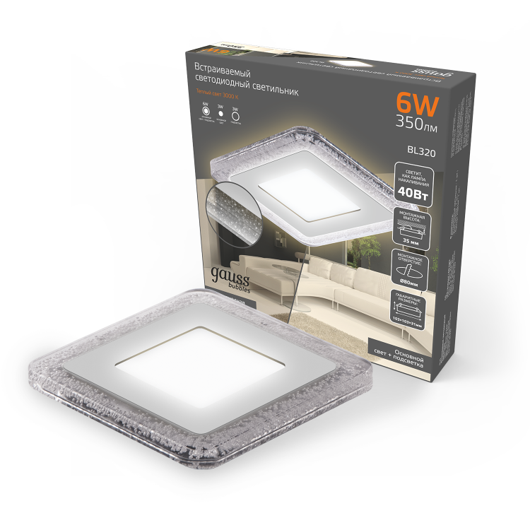 Светильник Gauss Bubbles встраиваемый BL320 форма - квадрат; цвет корпуса - белый с рисунком в виде полупрозрачных пузырьков. У него 3 режима работы: основной свет(центральная лампа), светодиодная подсветка (контур) и все включены. Мощность общего света составляет 6w (3w +3w). Контурный свет может быть использован в качестве ночника. Светильник имеет небольшую монтажную глубину, всего 3.1см и идеально подойдет даже для самых низких потолков, оформленных из гипсокартона или натяжной пленки. Яркость светового потока 350лм теплого белого 3000К света. Пылевлагозащита IP20 позволяет использовать светильник только в сухих помещениях.