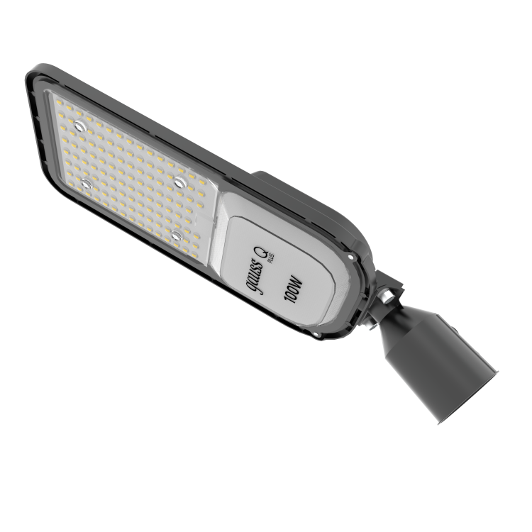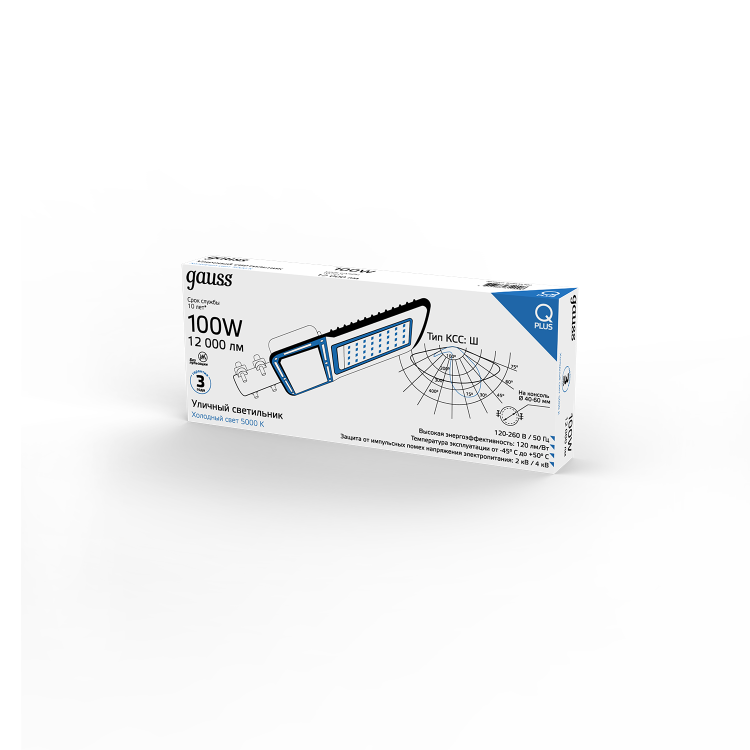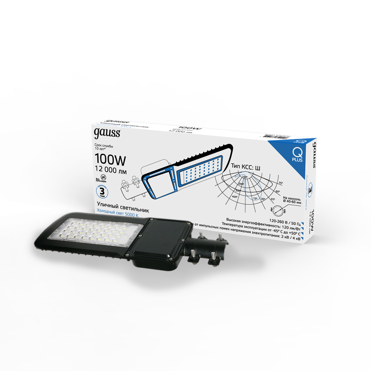 Светильник уличный консольный Gauss LED Qplus КСС "Ш" 100 W - новое слово в освещении больших территорий. Высокая эффективность в 120 лм/Вт плюс широкое светораспределение позволят максимально осветить как технические площадки: автостоянки, участки дорог, стройплощадки, склады; так и жилые: дворы, игровые площадки, зоны подъезда к территории, ландшафт, подсветка зданий. Высокая степень защиты от влажности IP65, крепкий ударопрочный корпус из литого алюминия, покрытого антикоррозийной краской, дают возможность широко применять консольный светильник Gauss LED Qplus КСС "Ш" в уличных сценариях.