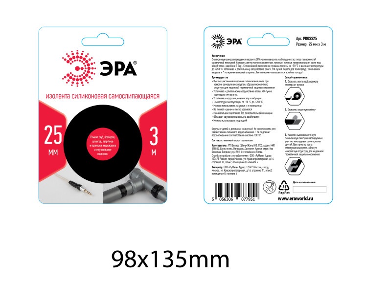 Силиконовую самослипающаюся изоленту ЭРА можно наносить на большинство типов поверхностей с различной текстурой. Наносить ленту можно на влажные, грязные, жирные поверхности или даже под водой (макс. давление 5 бар). Силиконовой изоленте не страшны морозы до -50 гр. по Цельсию и высокие температуры до +250 гр. по Цельсию. Устойчива к длительному воздействию влаги, УФ-лучей, перепадов температур, химических веществ и истеранию внешней стороны. Лентой можно пользоваться в любую погоду.